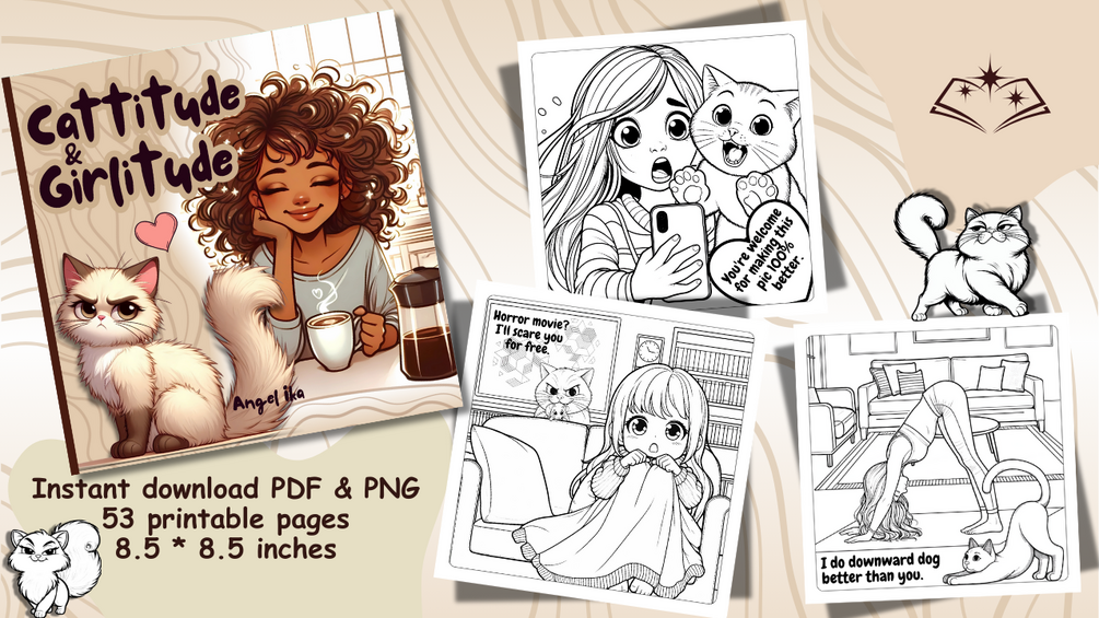 ✨ Bold girls, sassy cats, and lots of attitude! 53 fun coloring pages to print or color digitally, filled with humor, confidence, and playful everyday moments with a feline twist.