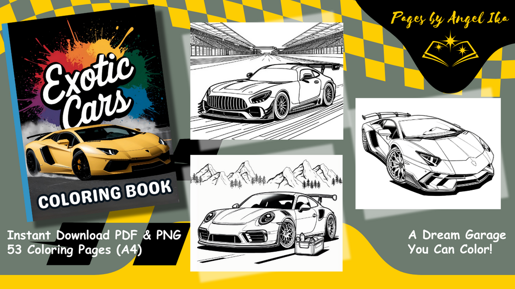 ✨ Rev up your creativity with this exotic car coloring book! 53 sleek and detailed pages to print or color digitally, perfect for relaxing, unwinding, and enjoying a high-octane creative break.